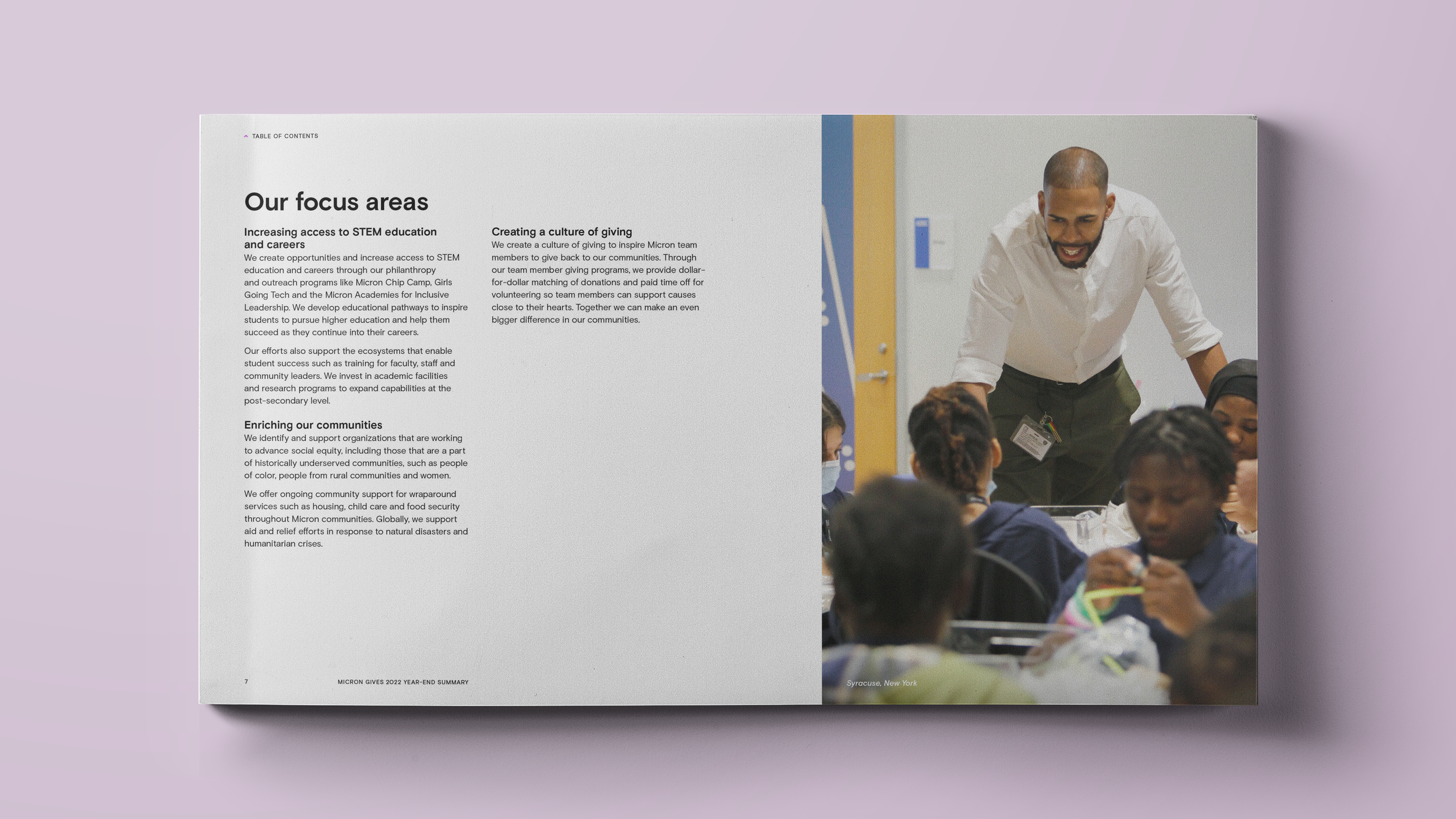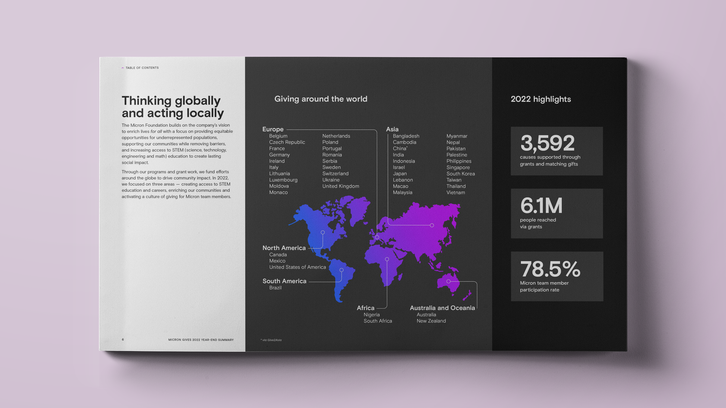 Micron’s charitable foundation, Micron Gives, produces a yearly summary of their work for public consumption. As a designer in the Micron Creative Studio I was the lead on the design and execution of the 2022 report. I owned all page layout, photo selection, data visualization and worked with senior members of the Gives team to publish and promote the final document.